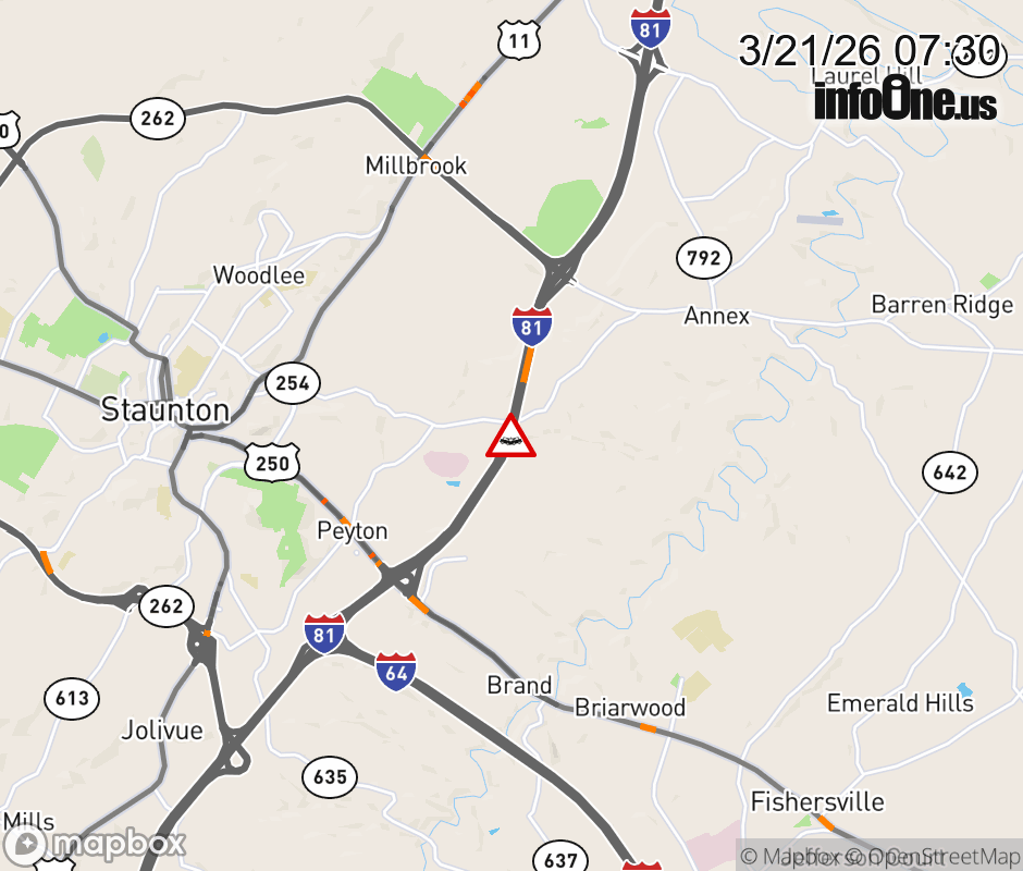On I-81 North at mile marker 224.2 in the County of Augusta, motorists can expect delays due to a tractor trailer crash. Updated: Sat 3/21/26 7:30 AM EDT ![]() Updated: Sat 3/21/26 7:30 AM EDT |