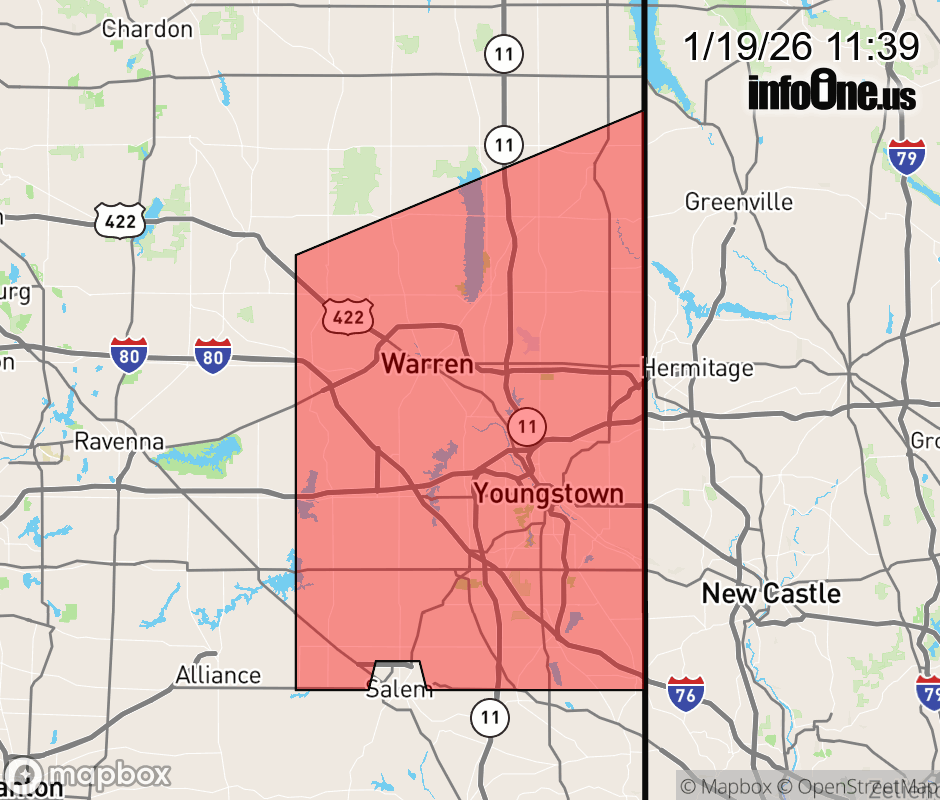 Canceled 1/19/26 12:15 PM Special Weather Statement issued January 19 at 11:37AM EST by NWS Cleveland OH At 1136 AM EST, radar indicated snow showers along a line extending from near Leavittsburg to near Columbiana, moving east at 35 mph. HAZARDS INCLUDE... Winds to 35 mph... Visibility occasionally dropping to less than one quarter of a mile... Up to 1 inch of quick snow accumulation... Motorists traveling on Interstate 80, 76, and 680 should use caution. Locations impacted include... Youngstown, Warren, Salem, Columbiana, Boardman, Niles, Campbell, Hubbard, Canfield, Cortland, Newton Falls, Lordstown, Kinsman, Vienna Center, Hilltop, Maplewood Park, Bristolville, Leavittsburg, Austintown, and Struthers. Use extra caution if you must travel. Rapid changes in visibility and potentially slick roads may lead to accidents. ![]() |