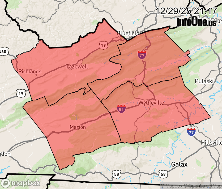 Canceled 12/30/25 6:57 AM Wind Advisory issued December 29 at 9:15PM EST until December 30 at 12:00PM EST by NWS Blacksburg VA * WHAT... For the Wind Advisory, west winds 20 to 30 mph with gusts up to 50 mph. For the Cold Weather Advisory, very cold wind chills as low as 7 below expected. * WHERE... Bland, Smyth, Tazewell, and Wythe Counties. * WHEN... For the Wind Advisory, until noon EST Tuesday. For the Cold Weather Advisory, until 10 AM EST Tuesday. * IMPACTS... Gusty winds will blow around unsecured objects. Tree limbs could be blown down and a few power outages may result. The cold wind chills as low as 5 below zero could result in hypothermia if precautions are not taken. ![]() |