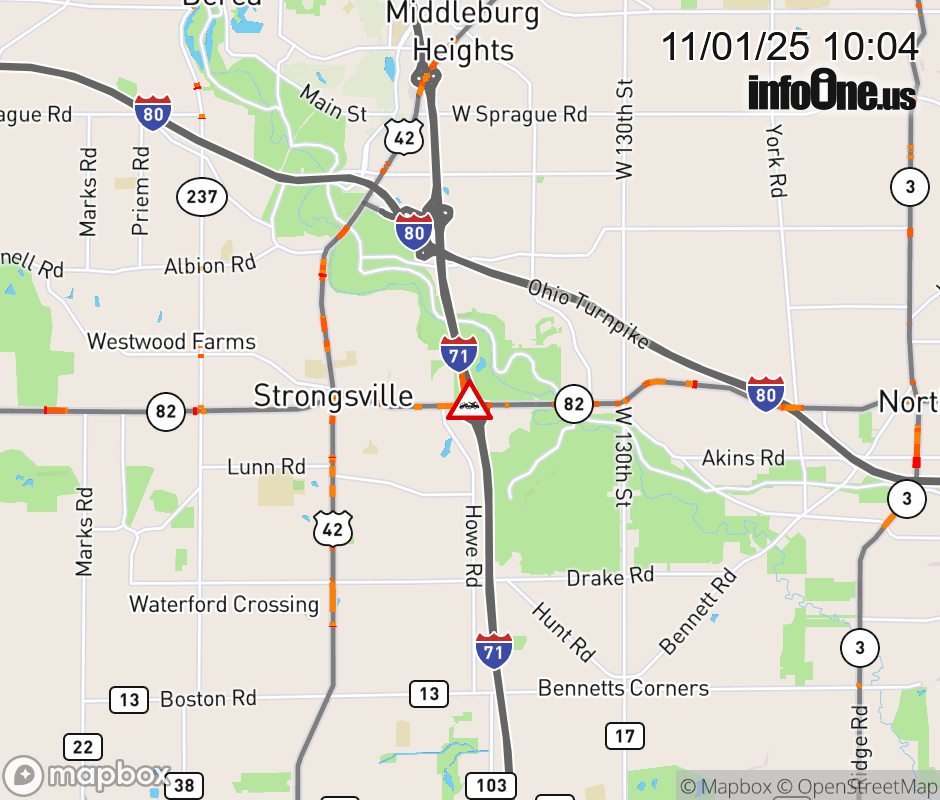 Ramp to SR-82/Royalton Rd from I-71 South is blocked due to disabled vehicle. Updated: Sat 11/1/25 10:04 AM EDT ![]() Updated: Sat 11/1/25 10:04 AM EDT |