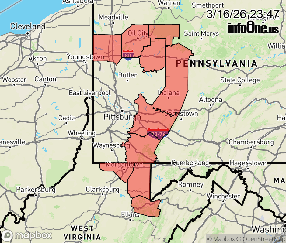 Canceled 3/17/26 3:59 AM Winter Weather Advisory issued March 16 at 11:46PM EDT until March 17 at 5:00PM EDT by NWS Pittsburgh PA * WHAT... Snow. Additional snow accumulations between 1 and 3 inches. Winds gusting as high as 40 mph. * WHERE... Portions of northwest Pennsylvania, Laurel Highlands, and the higher terrain of northern West Virginia. * WHEN... Until 5 PM EDT Tuesday. * IMPACTS... Plan on slippery road conditions. The hazardous conditions will impact the Tuesday morning and evening commutes. ![]() |