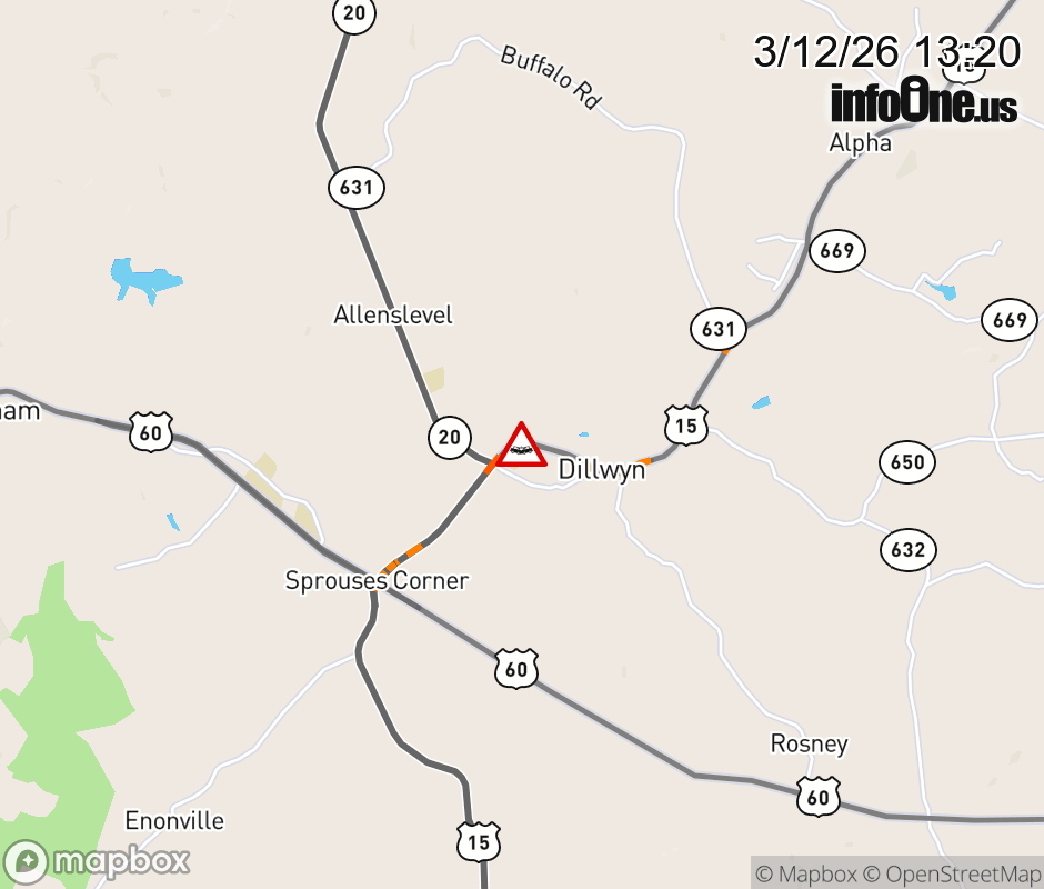 On US-15 North in the County of Buckingham, in the vicinity of Goldmine St; Rt. 1010E/W (Buckingham County); County/City/Town Line: EAST @ DILLWYN, motorists can expect delays due to a vehicle crash. Lane closures exist. ![]() |
