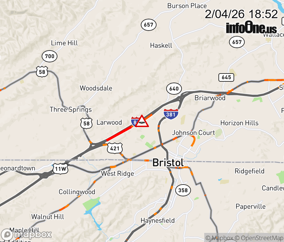 On I-81 at mile marker 2.6 in the City of Bristol, motorists can expect delays due to a tractor trailer crash. The north right shoulder is closed. Updated: Wed 2/4/26 6:52 PM EST ![]() Updated: Wed 2/4/26 6:52 PM EST |