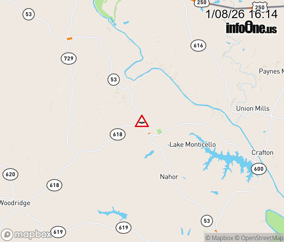 On Rt. 618 in the County of Fluvanna, in the vicinity of Thomas Jefferson Pkwy; VA-53E/W, motorists can expect delays due to a vehicle crash. All east lanes are closed. All west lanes are closed. ![]() |