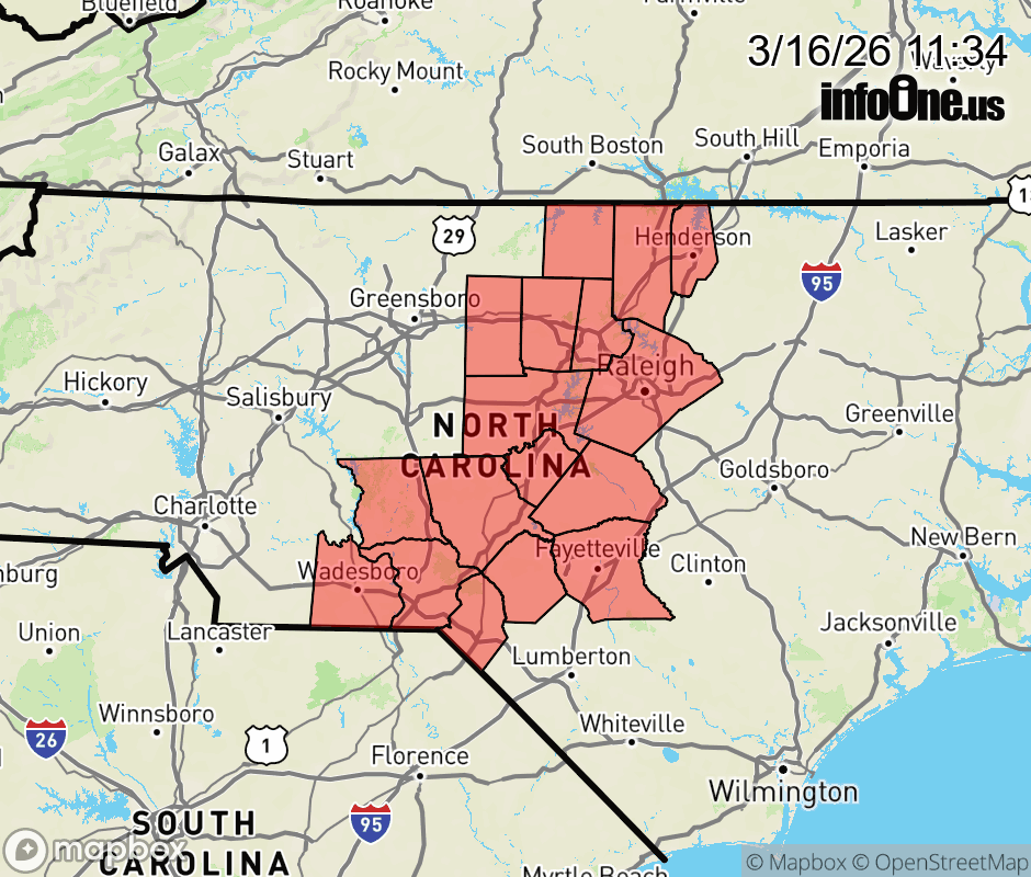 Canceled 3/16/26 1:22 PM Tornado Watch issued March 16 at 11:33AM EDT until March 16 at 2:00PM EDT by NWS Raleigh NC TORNADO WATCH 66 REMAINS VALID UNTIL 2 PM EDT THIS AFTERNOON FOR THE FOLLOWING AREAS IN NORTH CAROLINA THIS WATCH INCLUDES 17 COUNTIES IN CENTRAL NORTH CAROLINA ALAMANCE ANSON CHATHAM CUMBERLAND DURHAM GRANVILLE HARNETT HOKE LEE MONTGOMERY MOORE ORANGE PERSON RICHMOND SCOTLAND VANCE WAKE THIS INCLUDES THE CITIES OF ABERDEEN, ANGIER, APEX, BUIES CREEK, BURLINGTON, CAMP MACKALL, CARRBORO, CARTHAGE, CARY, CHAPEL HILL, CREEDMOOR, DUNN, DURHAM, ELLERBE, ERWIN, FAYETTEVILLE, GRAHAM, HENDERSON, HILLSBOROUGH, HOPE MILLS, KITTRELL, KNIGHTDALE, LAURINBURG, LILLINGTON, MEBANE, OXFORD, PINEHURST, PITTSBORO, POLKTON, RAEFORD, RALEIGH, ROCKINGHAM, ROUGEMONT, ROXBORO, SANFORD, SILER CITY, SOUTHERN PINES, SPRING LAKE, TROY, WADESBORO, WAGRAM, AND WAKE FOREST. ![]() |