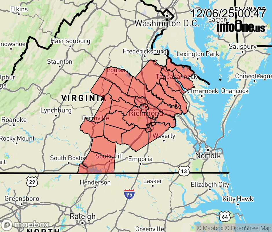 Canceled 12/6/25 8:00 AM Winter Weather Advisory issued December 6 at 12:45AM EST until December 6 at 8:00AM EST by NWS Wakefield VA * WHAT... Areas of freezing fog and freezing drizzle. * WHERE... Portions of central, east central, north central, and south central Virginia. * WHEN... Until 8 AM EST this morning. * IMPACTS... Very slippery sidewalks, roads and bridges are possible. Untreated surfaces may refreeze, leading to a black ice threat. ![]() |