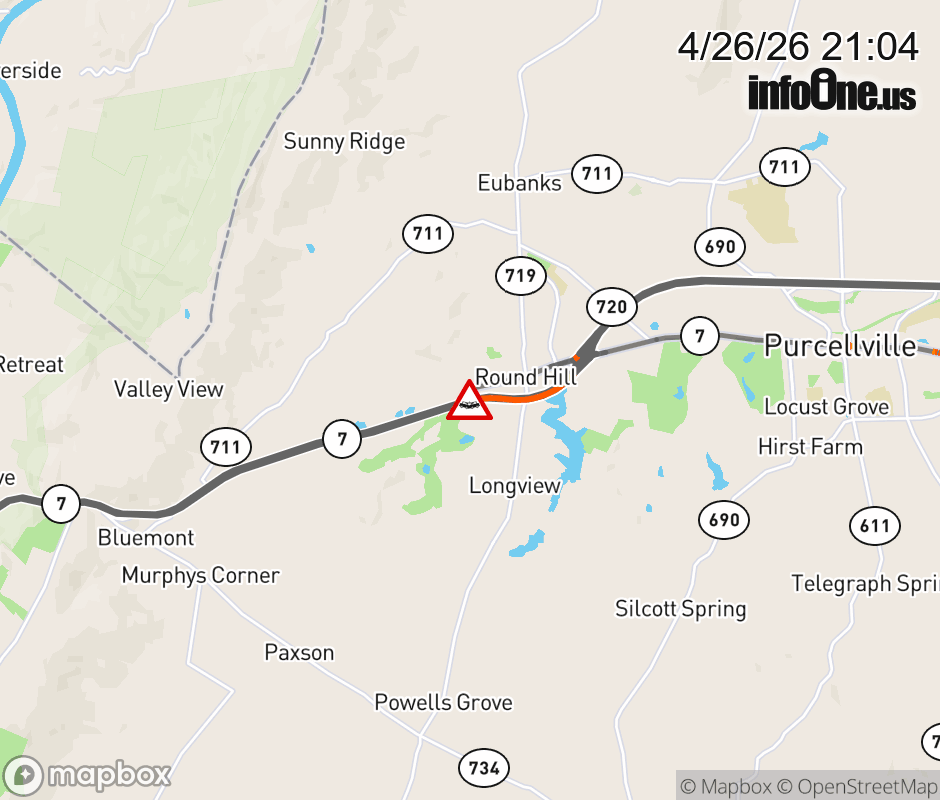 Leesburg Pike and W Loudoun St in the County of Loudoun, motorists can expect delays due to a vehicle crash. Lane closures exist. Updated: Sun 4/26/26 9:04 PM EDT ![]() Updated: Sun 4/26/26 9:04 PM EDT |