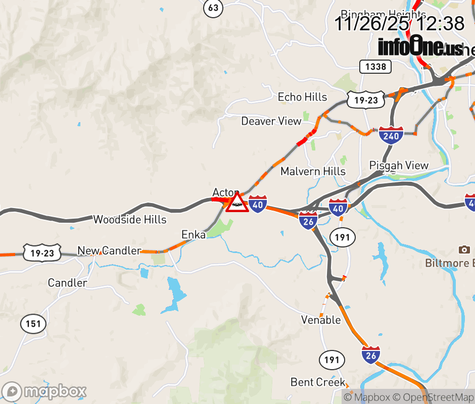 The right lane is closed near Exit 44, US 74-Alt (Smokey Park Highway). Updated: Wed 11/26/25 12:38 PM EST ![]() Updated: Wed 11/26/25 12:38 PM EST |