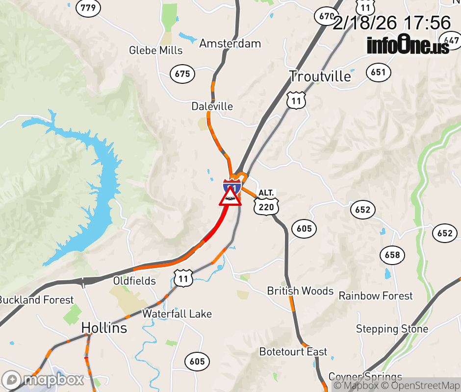 On I-81 at mile marker 150 in the County of Botetourt, motorists can expect delays due to a multi-vehicle crash. The north right shoulder is closed. The north exit ramp narrows. Updated: Wed 2/18/26 5:56 PM EST ![]() Updated: Wed 2/18/26 5:56 PM EST |