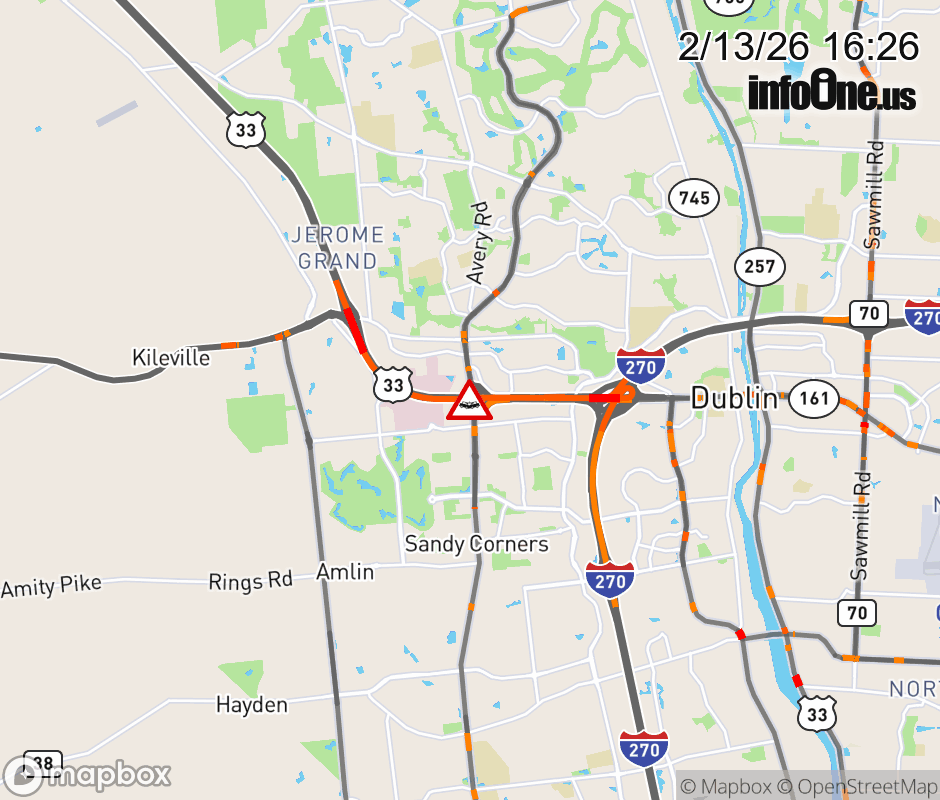 The right lane is blocked on US-33/SR-161 East at Avery - Muirfield Dr, due to a crash. Updated: Fri 2/13/26 4:26 PM EST ![]() Updated: Fri 2/13/26 4:26 PM EST |