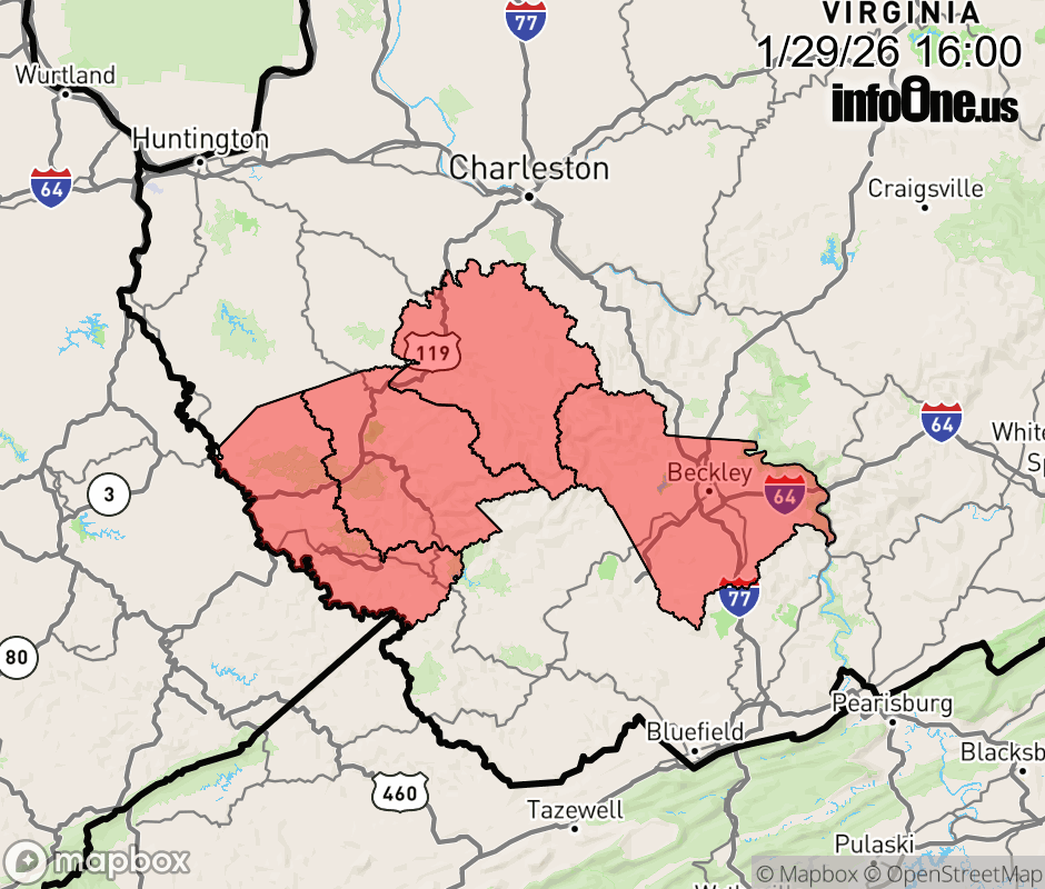 Canceled 1/29/26 11:22 PM Winter Weather Advisory issued January 29 at 4:00PM EST until January 31 at 10:00PM EST by NWS Charleston WV * WHAT... Snow expected. Total snow accumulations between 2 and 4 inches. * WHERE... Northwest Raleigh, Boone, Logan, and Mingo Counties. * WHEN... From 7 AM Friday to 10 PM EST Saturday. * IMPACTS... Plan on slippery road conditions. The hazardous conditions could impact the Friday morning and evening commutes. ![]() |