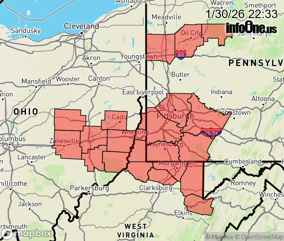 Canceled 1/30/26 11:25 PM Cold Weather Advisory issued January 30 at 10:32PM EST until January 31 at 11:00AM EST by NWS Pittsburgh PA * WHAT... Very cold wind chills as low as 20 below zero. * WHERE... Portions of east central Ohio, northwest, southwest, and western Pennsylvania, and northern and the northern panhandle of West Virginia. * WHEN... Until 11 AM EST Saturday. * IMPACTS... The cold wind chills as low as 15 below zero could result in hypothermia or frostbite if precautions are not taken. An extended period of freezing temperatures could cause ruptured water pipes. ![]() |