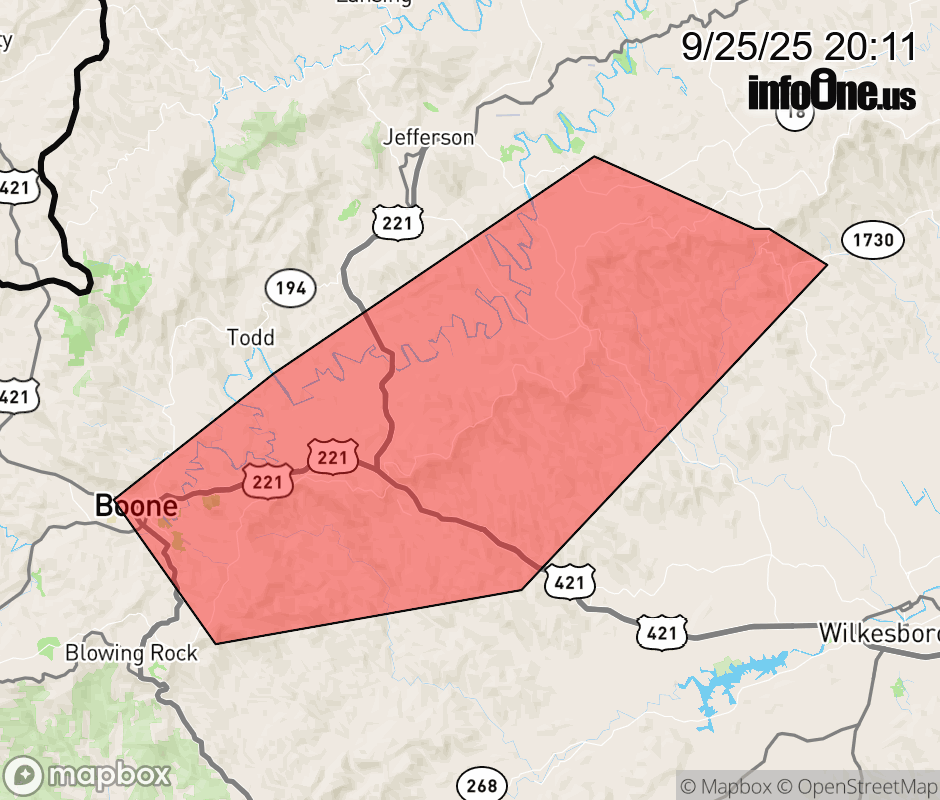 Canceled 9/25/25 10:21 PM Flood Advisory issued September 25 at 8:10PM EDT until September 25 at 11:15PM EDT by NWS Blacksburg VA * WHAT... Flooding caused by excessive rainfall is expected. * WHERE... A portion of northwest North Carolina, including the following counties, Ashe, Watauga and Wilkes. * WHEN... Until 1115 PM EDT. * IMPACTS... Minor flooding in low-lying and poor drainage areas. Some low-water crossings may become impassable. Ponding of water in urban or other areas is occurring or is imminent. * ADDITIONAL DETAILS... - At 810 PM EDT, Doppler radar indicated heavy rain due to thunderstorms. Minor flooding is ongoing or expected to begin shortly in the advisory area. Between 1.5 and 2.5 inches of rain have fallen. - This includes the following streams and drainages... Little Peak Creek, Middle Fork Reddies River, Call Creek, Grassy Creek, Little Fork, Elk Creek, Darnell Creek, Mill Creek, Clear Branch, Fall Creek, Beaver Creek, Little Fork Creek, Dugger Creek, Meat Camp Creek, Church Branch, Flat Branch and Left Prong Stony Fork. Additional rainfall amounts up to 1 inch are expected over the area. This additional rain will result in minor flooding. - Some locations that will experience flooding include... Boone... Deep Gap... Glendale Springs... Wilbar... Mc Grady... Cascade Falls... Summit... - http://www.weather.gov/safety/flood ![]() |