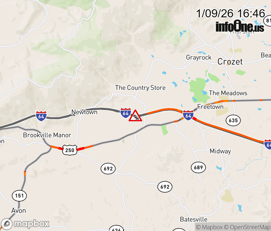 On I-64 West at mile marker 105.6 in the County of Albemarle, motorists can expect delays due to a vehicle fire. Traffic backups are approximately 6.0 miles. Updated: Fri 1/9/26 4:46 PM EST ![]() Updated: Fri 1/9/26 4:46 PM EST |
