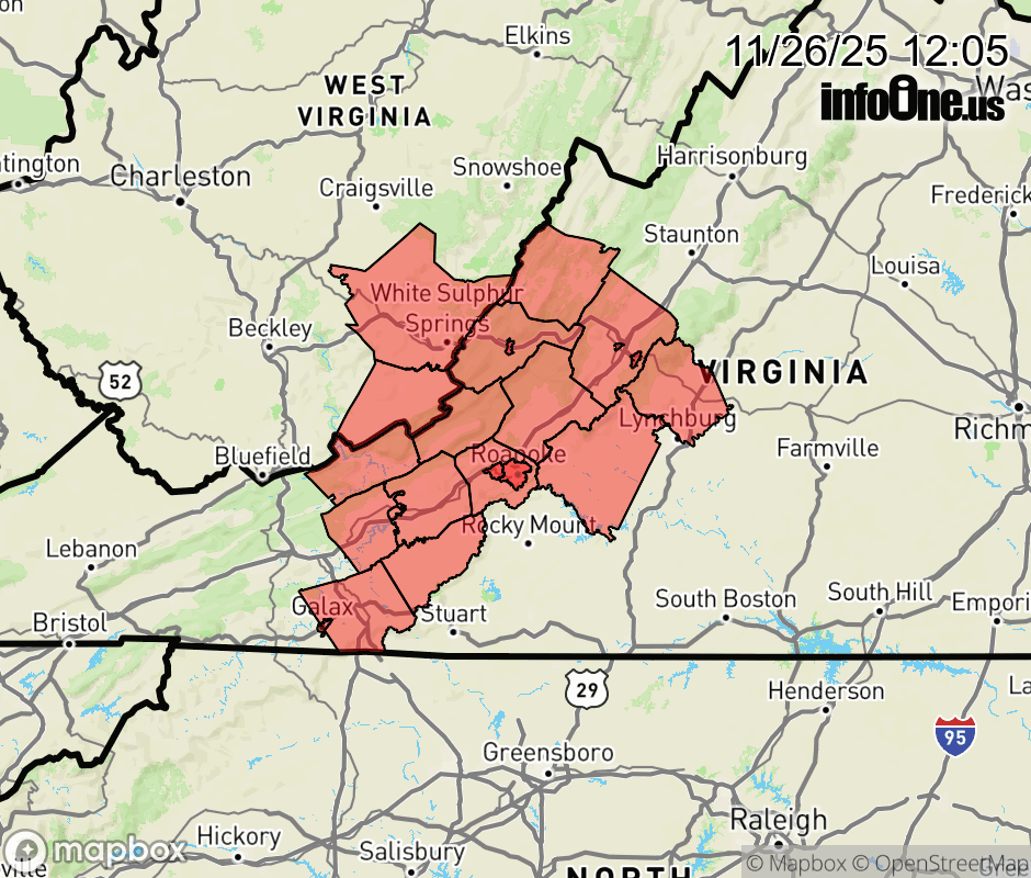 Wind Advisory issued November 26 at 12:04PM EST until November 27 at 11:00AM EST by NWS Blacksburg VA * WHAT... West winds 10 to 25 mph with gusts up to 50 mph expected. * WHERE... Portions of southwest Virginia and southeast West Virginia. * WHEN... From 7 PM this evening to 11 AM EST Thursday. * IMPACTS... Gusty winds will blow around unsecured objects. Tree limbs could be blown down and a few power outages may result. ![]() |
