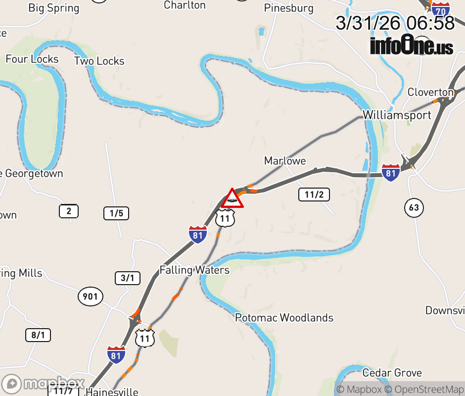 Vehicle Crash on US-11 (Williamsport Pike) & I-81 North Ramps (MM 23) in Falling Waters. The northbound road is closed. The southbound road is closed. Updated: Tue 3/31/26 6:58 AM EDT ![]() Updated: Tue 3/31/26 6:58 AM EDT |