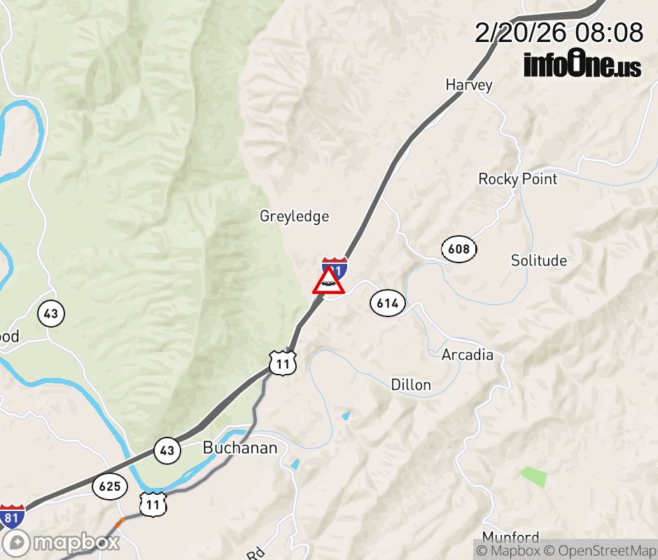 On I-81 at mile marker 168.9 in the County of Botetourt, motorists can expect delays due to a vehicle crash. The south left shoulder and left lane are closed. Updated: Fri 2/20/26 8:08 AM EST ![]() Updated: Fri 2/20/26 8:08 AM EST |