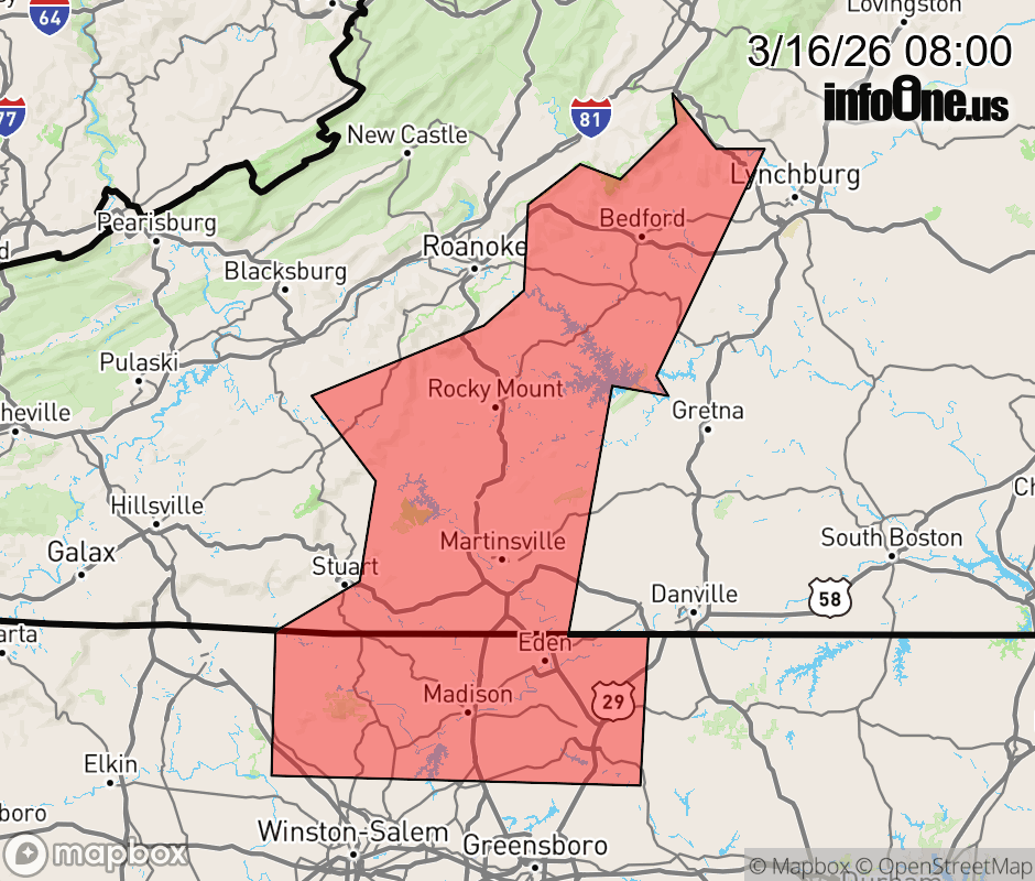 Canceled 3/16/26 8:25 AM Severe Thunderstorm Warning issued March 16 at 7:59AM EDT until March 16 at 9:00AM EDT by NWS Blacksburg VA SVRRNK The National Weather Service in BLACKSBURG has issued a * Severe Thunderstorm Warning for... Stokes County in north central North Carolina... Rockingham County in north central North Carolina... Northeastern Floyd County in southwestern Virginia... The City of Martinsville in south central Virginia... Bedford County in south central Virginia... Henry County in south central Virginia... Eastern Patrick County in southwestern Virginia... Franklin County in west central Virginia... * Until 900 AM EDT. * At 759 AM EDT, severe thunderstorms were located along a line extending from near Callaway to near Critz to near Pinnacle, moving northeast at 40 mph. HAZARD...60 mph wind gusts. SOURCE...Radar indicated. IMPACT...Expect damage to roofs, siding, and trees. * Locations impacted include... Eden, Reidsville, Martinsville, Bedford, Rocky Mount, Wentworth, and Mayodan. ![]() |