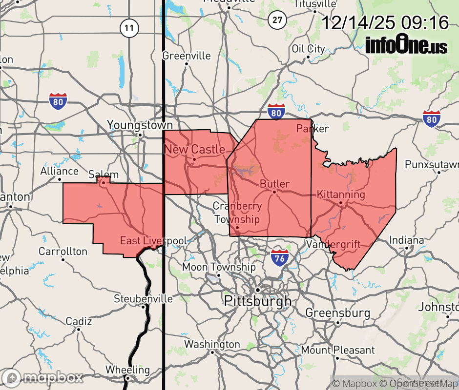 Canceled 12/14/25 1:00 PM Winter Weather Advisory issued December 14 at 9:13AM EST until December 14 at 1:00PM EST by NWS Pittsburgh PA * WHAT... Snow. Additional snow accumulations 1 to 2 inches. * WHERE... In Ohio, Columbiana County. In Pennsylvania, Lawrence, Armstrong, and Butler Counties. * WHEN... Until 1 PM EST this afternoon. * IMPACTS... Plan on slippery road conditions. ![]() |
