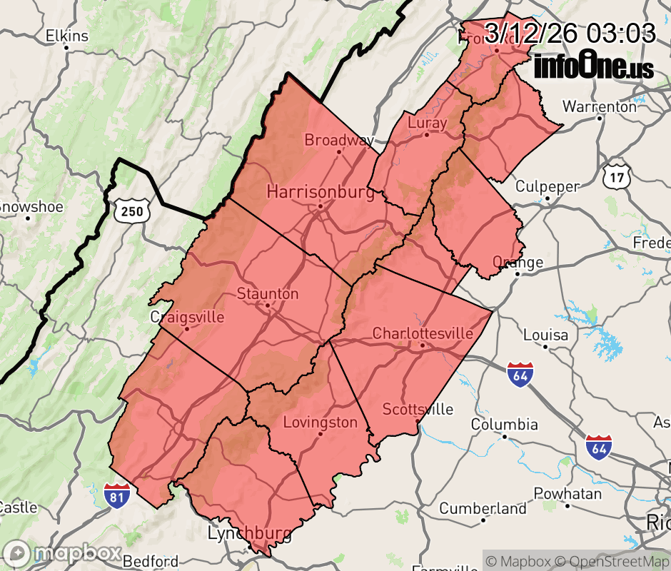 Canceled 3/12/26 10:08 AM Winter Weather Advisory issued March 12 at 3:02AM EDT until March 12 at 3:00PM EDT by NWS Baltimore MD/Washington DC * WHAT... Wet snow expected. Total snow accumulations of one to three inches. Winds gusting as high as 35 mph. * WHERE... Central Virginia Blue Ridge and Northern Virginia Blue Ridge. * WHEN... From 10 AM this morning to 3 PM EDT this afternoon. * IMPACTS... Plan on slippery road conditions due to a heavy, slushy snow. Visibility could be reduced below one-half mile at times. Gusty winds could bring down tree branches. * ADDITIONAL DETAILS... Rain early this morning will change over to a brief period of very heavy and wet snow by mid-morning, before ending early this afternoon. ![]() |