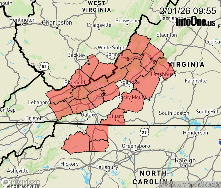 Canceled 2/1/26 12:45 PM Extreme Cold Warning issued February 1 at 9:53AM EST until February 1 at 1:00PM EST by NWS Blacksburg VA * WHAT... Dangerously cold wind chills as low as 10 below. * WHERE... Portions of north central and northwest North Carolina, central, south central, southwest, and west central Virginia, and southeast West Virginia. * WHEN... Until 1 PM EST this afternoon. * IMPACTS... The cold wind chills as low as 10 below zero could result in hypothermia if precautions are not taken. Frostbite and hypothermia will occur if unprotected skin is exposed to these temperatures. ![]() |