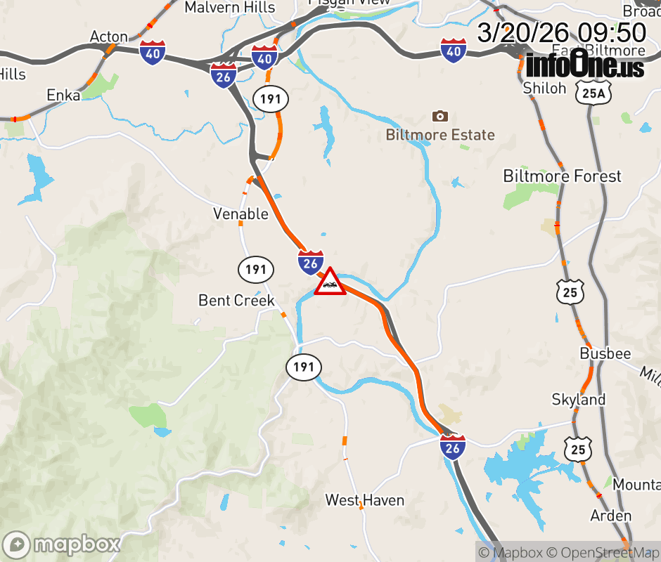 The right lane is closed 1 mile after Exit 33, NC 191 (Brevard Road). Updated: Fri 3/20/26 9:50 AM EDT ![]() Updated: Fri 3/20/26 9:50 AM EDT |