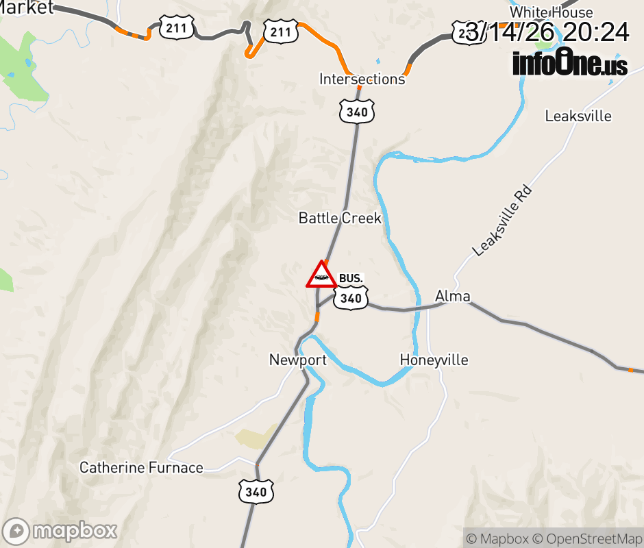 On US-340 in the County of Page, in the vicinity of Battlecreek Rd; Rockingham Dr; Rt. 615N/S (Page County), motorists can expect delays due to a vehicle crash. All north lanes are closed. All south lanes are closed. ![]() |