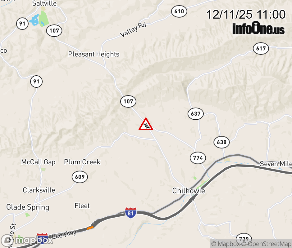 On VA-107 in the County of Smyth, in the vicinity of Lyons Gap Rd; Rt. 774N/S (Smyth County), motorists can expect delays due to a vehicle fire. All north lanes are closed. ![]() |