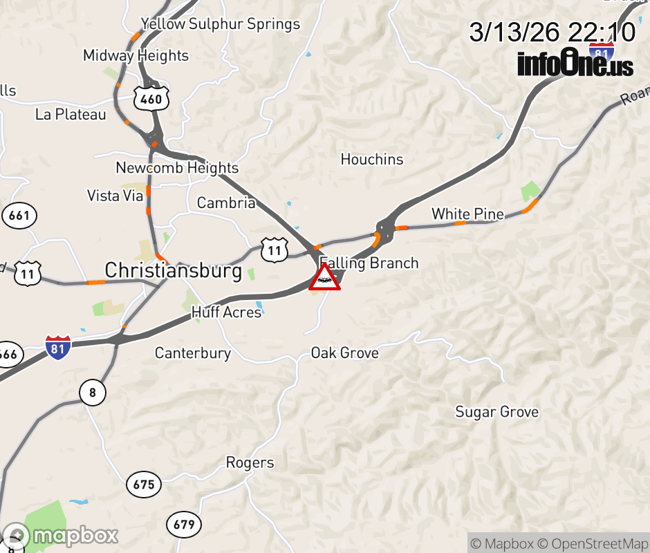 On I-81 at mile marker 117.4 in the Town of Christiansburg, motorists can expect delays due to a vehicle crash. The north entrance ramp narrows. Updated: Fri 3/13/26 10:10 PM EDT ![]() Updated: Fri 3/13/26 10:10 PM EDT |