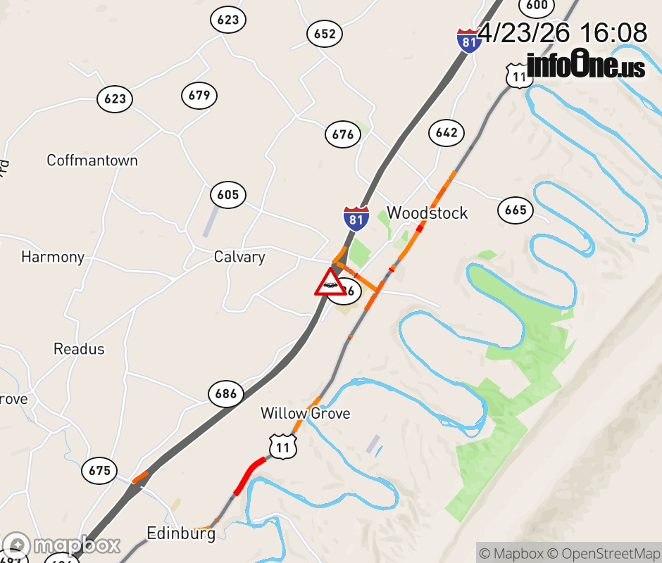 On I-81 at mile marker 283 in the Town of Woodstock, motorists can expect delays due to a vehicle crash. The south entrance ramp narrows. Updated: Thu 4/23/26 4:08 PM EDT ![]() Updated: Thu 4/23/26 4:08 PM EDT |