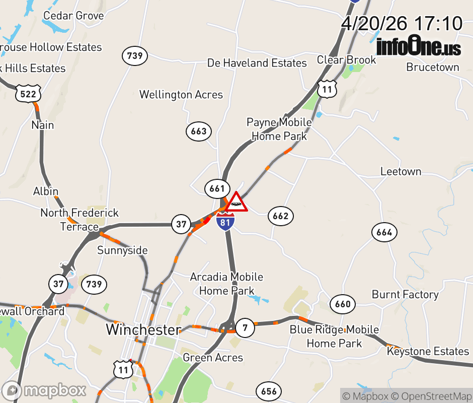 On US-11 in the County of Frederick, in the vicinity of Martinsburg Pike; US-11S, motorists can expect delays due to a vehicle crash. The north right shoulder is closed. ![]() |