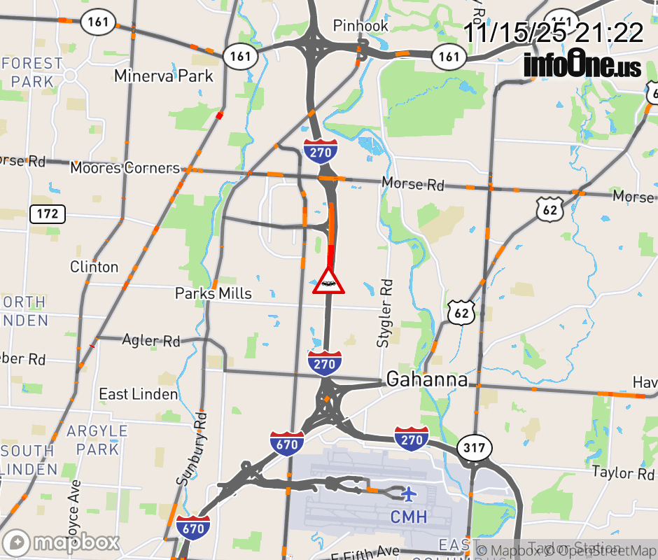 All lanes are closed on I-270 South beyond Easton Way, due to a crash. Updated: Sat 11/15/25 9:22 PM EST ![]() Updated: Sat 11/15/25 9:22 PM EST |