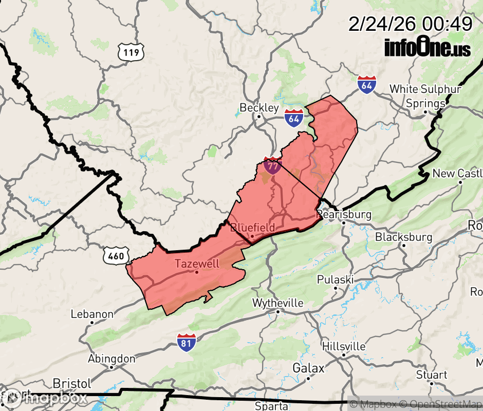 Canceled 2/24/26 4:51 AM Winter Storm Warning issued February 24 at 12:48AM EST until February 24 at 5:00AM EST by NWS Blacksburg VA * WHAT... Heavy snow. Additional snow accumulations up to two inches. * WHERE... In Virginia, Tazewell County. In West Virginia, Mercer and Summers Counties. * WHEN... Until 5 AM EST early this morning. * IMPACTS... Visibilities may drop below 1/4 mile due to falling and blowing snow. Plan on slippery road conditions. ![]() |