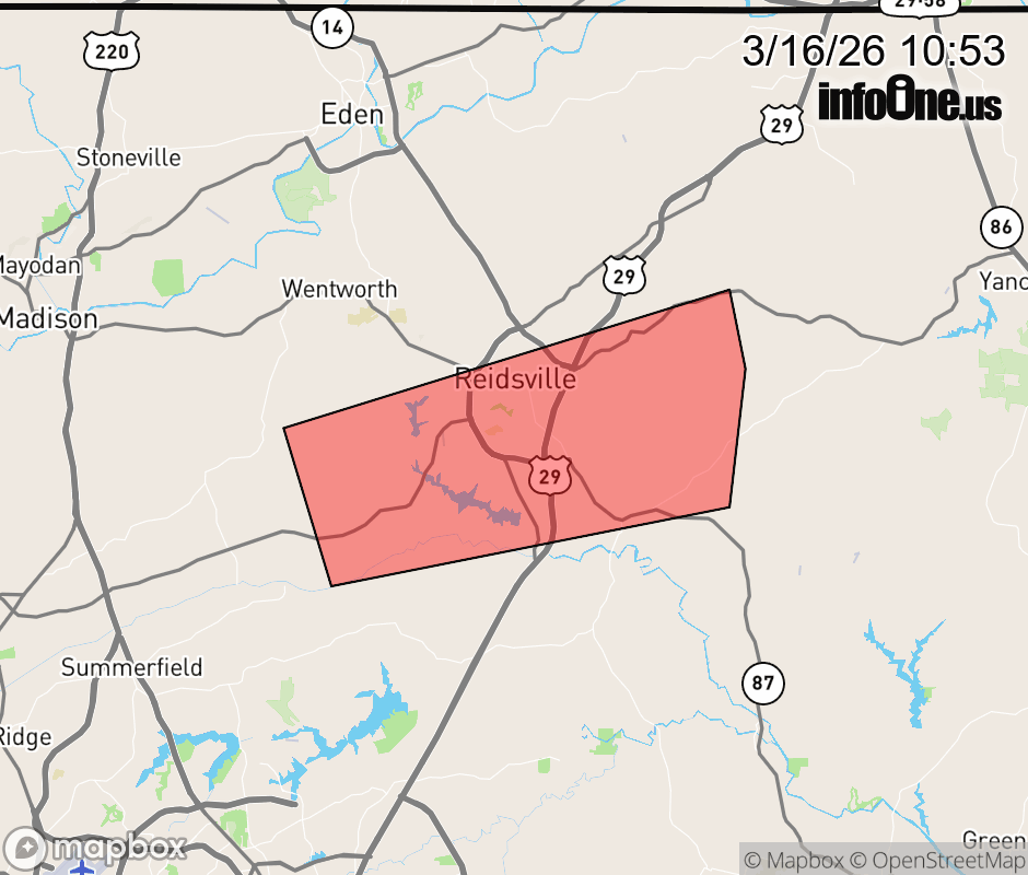Canceled 3/16/26 11:15 AM Tornado Warning issued March 16 at 10:52AM EDT until March 16 at 11:15AM EDT by NWS Blacksburg VA At 1052 AM EDT, a severe thunderstorm capable of producing a tornado was located over Monroeton, or near Reidsville, moving east at 50 mph. HAZARD...Tornado. SOURCE...Radar indicated rotation. IMPACT...Flying debris will be dangerous to those caught without shelter. Mobile homes will be damaged or destroyed. Damage to roofs, windows, and vehicles will occur. Tree damage is likely. Locations impacted include... Reidsville... Monroeton... and Haw River State Park. ![]() |