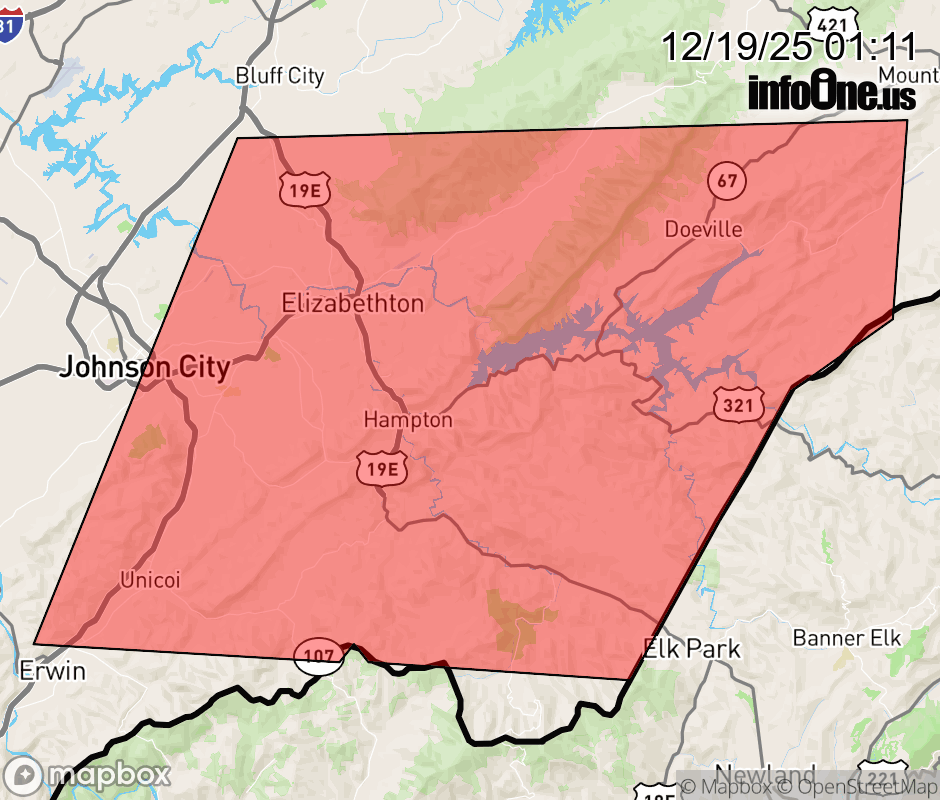 Canceled 12/19/25 1:30 AM Severe Thunderstorm Warning issued December 19 at 1:10AM EST until December 19 at 1:30AM EST by NWS Morristown TN At 110 AM EST, a severe thunderstorm was located near Hampton, or near Elizabethton, moving east at 45 mph. HAZARD...60 mph wind gusts. SOURCE...Radar indicated. IMPACT...Expect damage to roofs, siding, and trees. Locations impacted include... Johnson City, Elizabethton, Erwin, Central, Hampton, Pine Crest, Unicoi, Watauga, Hunter, and Roane Mountain State Park. This includes Interstate 26 in Tennessee between mile markers 23 and 36. ![]() |