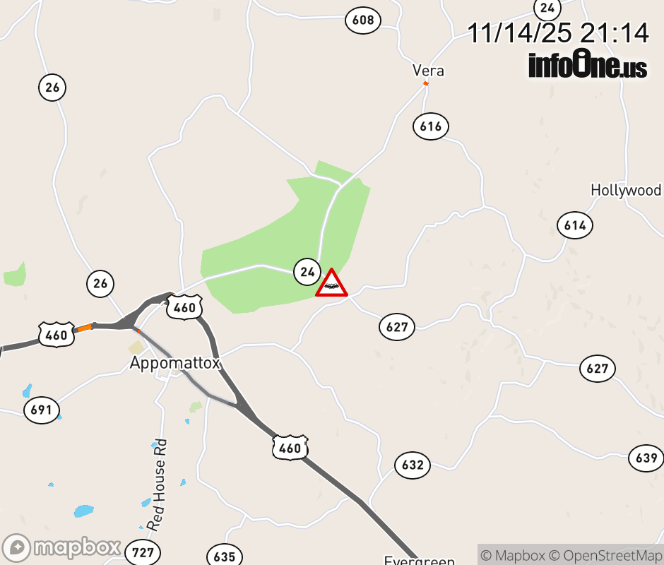On Rt. 627 East in the County of Appomattox, in the vicinity of Oakleigh Ave; Trents Mill Rd; Rt. 631N/S (Appomattox County), motorists can expect delays due to a vehicle crash. Lane closures exist.