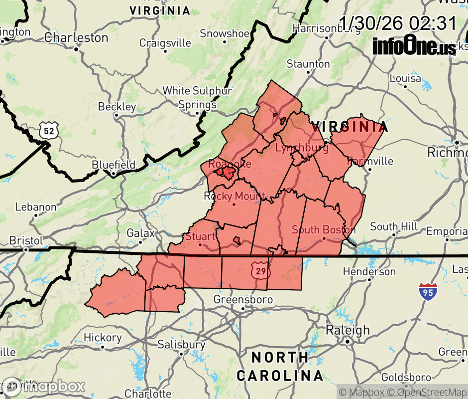 Canceled 1/30/26 2:31 PM Extreme Cold Watch issued January 30 at 2:30AM EST until February 1 at 10:00AM EST by NWS Blacksburg VA * WHAT... Dangerously cold wind chills as low as 9 below possible. * WHERE... Portions of north central and northwest North Carolina and central, south central, southwest, and west central Virginia. * WHEN... From Saturday evening through Sunday morning. * IMPACTS... The cold wind chills as low as 10 below zero could result in hypothermia if precautions are not taken. Frostbite and hypothermia will occur if unprotected skin is exposed to these temperatures. ![]() |