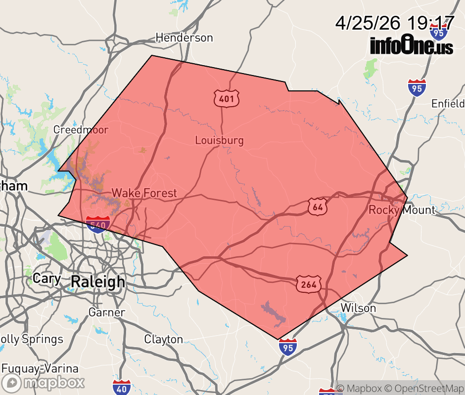 Canceled 4/25/26 8:15 PM Special Weather Statement issued April 25 at 7:15PM EDT by NWS Raleigh NC At 715 PM EDT, Doppler radar was tracking a cluster of strong thunderstorms along a line extending from 8 miles northeast of RDU International to 7 miles northwest of Zebulon to 7 miles southwest of Bailey. Movement was northeast at 20 mph. HAZARD...Wind gusts up to 40 mph. SOURCE...Radar indicated. IMPACT...Gusty winds could knock down tree limbs and blow around unsecured objects. Locations impacted include... Rocky Mount, Nashville, Louisburg, Wilson, Wake Forest, Zebulon, Franklinton, Elm City, Dortches, and Bailey. This includes the following highways... Interstate 95 between Mile Markers 141 and 116. Interstate 540 between Mile Markers 9 and 12, and between Mile Markers 13 and 14. NC Highway 264 between Mile Markers 20 and 38. ![]() |