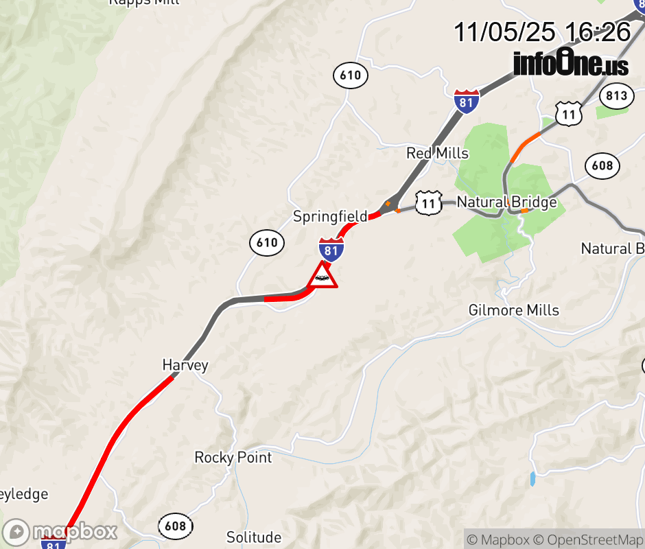 On I-81 North at mile marker 174.6 in the County of Rockbridge, motorists can expect delays due to a vehicle crash. Traffic backups are approximately 4.5 miles. Updated: Wed 11/5/25 4:26 PM EST ![]() Updated: Wed 11/5/25 4:26 PM EST |