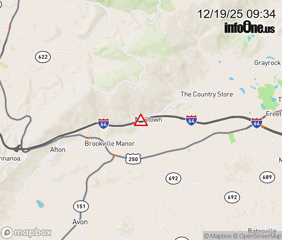 On I-64 East at mile marker 103.8 in the County of Albemarle, motorists can expect delays due to a vehicle crash. Updated: Fri 12/19/25 9:34 AM EST ![]() Updated: Fri 12/19/25 9:34 AM EST |