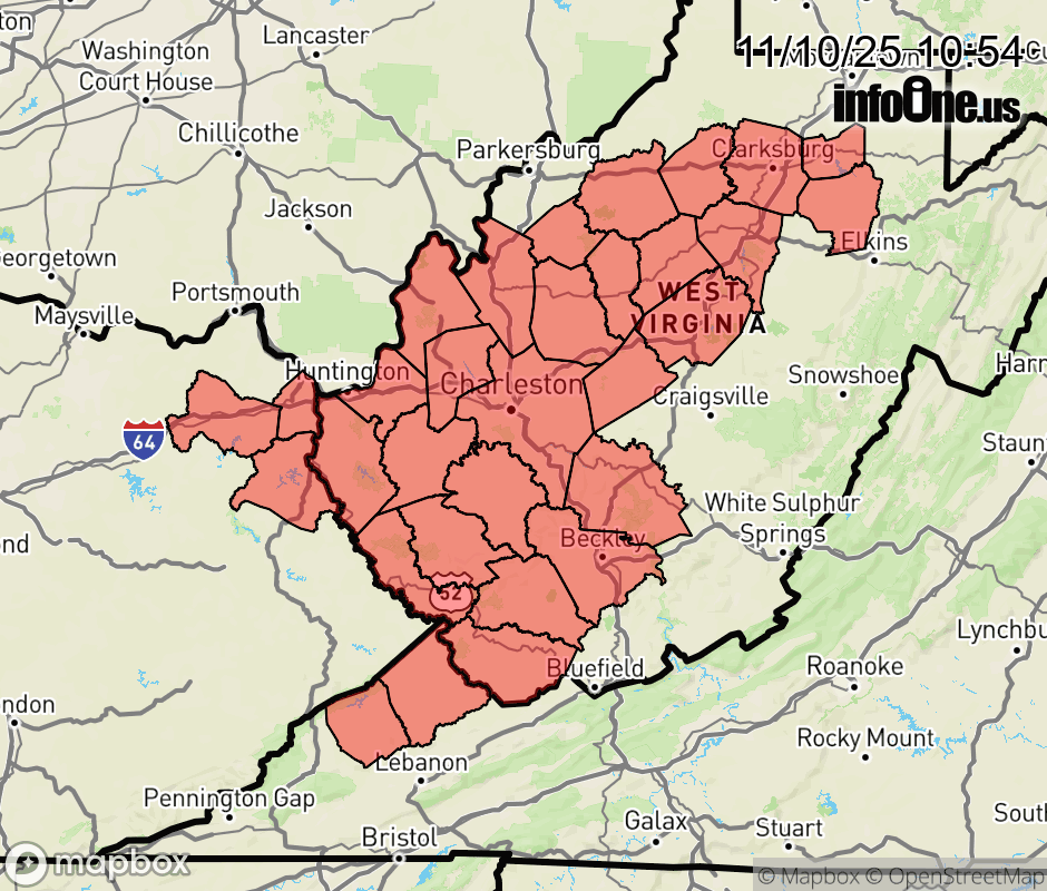 Canceled 11/10/25 9:44 PM Winter Weather Advisory issued November 10 at 10:53AM EST until November 11 at 7:00AM EST by NWS Charleston WV * WHAT... Snow. Additional snow accumulations between 1 and 3 inches. * WHERE... Portions of northeast Kentucky, southwest Virginia, and central, northern, southeast, southern, and western West Virginia. * WHEN... Until 7 AM EST Tuesday. * IMPACTS... Plan on slippery road conditions. The hazardous conditions could impact the Monday evening and Tuesday morning commutes. ![]() |