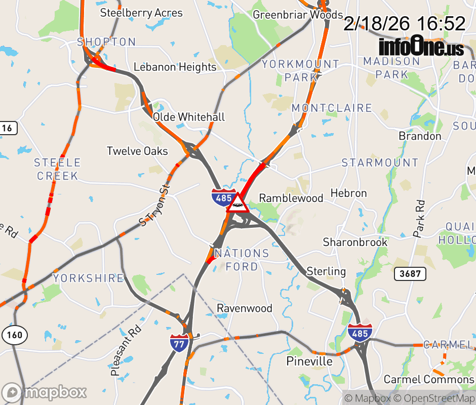 The left shoulder is closed prior to Exit 1A (I-485). Updated: Wed 2/18/26 4:52 PM EST ![]() Updated: Wed 2/18/26 4:52 PM EST |