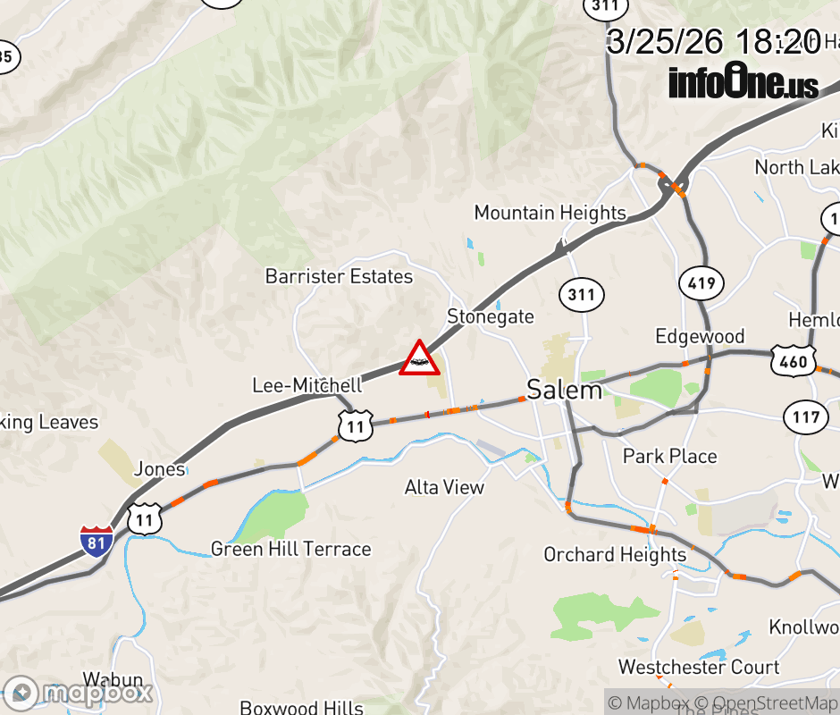 On I-81 at mile marker 138.2 in the County of Roanoke, motorists can expect delays due to a tractor trailer crash. The north right shoulder is closed. ![]() |