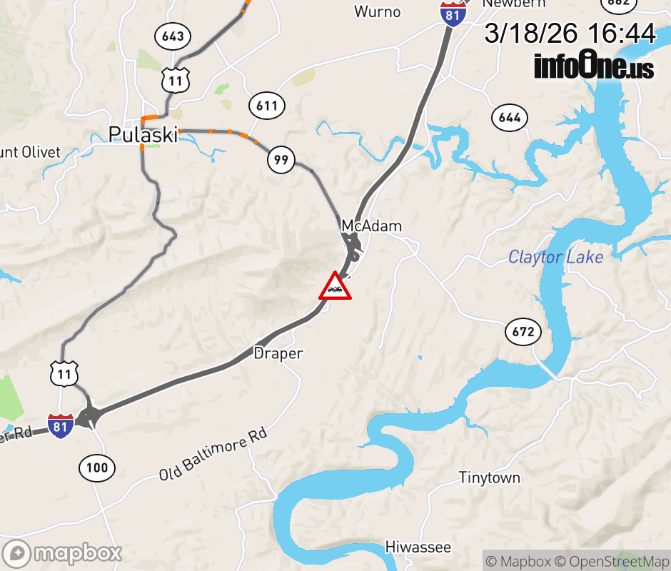 On I-81 North at mile marker 93.8 in the County of Pulaski, motorists can expect delays due to a disabled vehicle. Updated: Wed 3/18/26 4:44 PM EDT ![]() Updated: Wed 3/18/26 4:44 PM EDT |