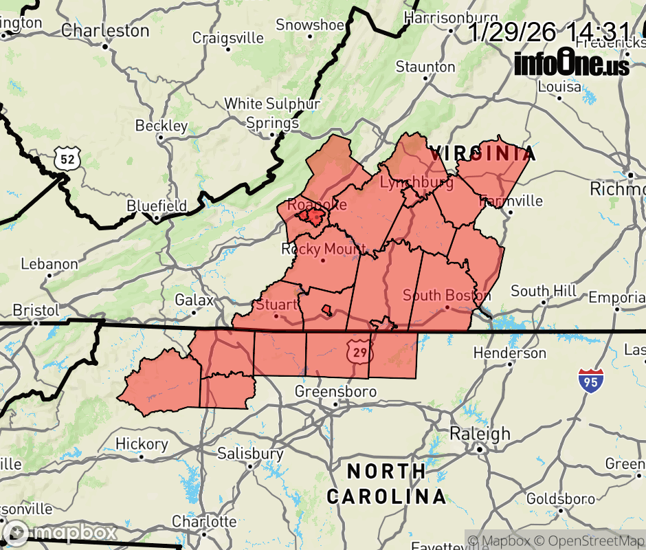 Canceled 1/29/26 7:03 PM Winter Storm Watch issued January 29 at 2:29PM EST until February 1 at 1:00PM EST by NWS Blacksburg VA * WHAT... Heavy snow possible. Total snow accumulations between 4 and 8 inches possible with the highest amounts south of Route 460. * WHERE... Portions of north central and northwest North Carolina and central, south central, southwest, and west central Virginia. * WHEN... From Friday afternoon through Sunday afternoon. * IMPACTS... Travel could become very difficult during Friday and the upcoming weekend due to the snow. The hazardous conditions could impact the Friday evening commute. * ADDITIONAL DETAILS... Gusty winds during Saturday night into Sunday may cause blowing and drifting snow, which could cause poor visibility. ![]() |