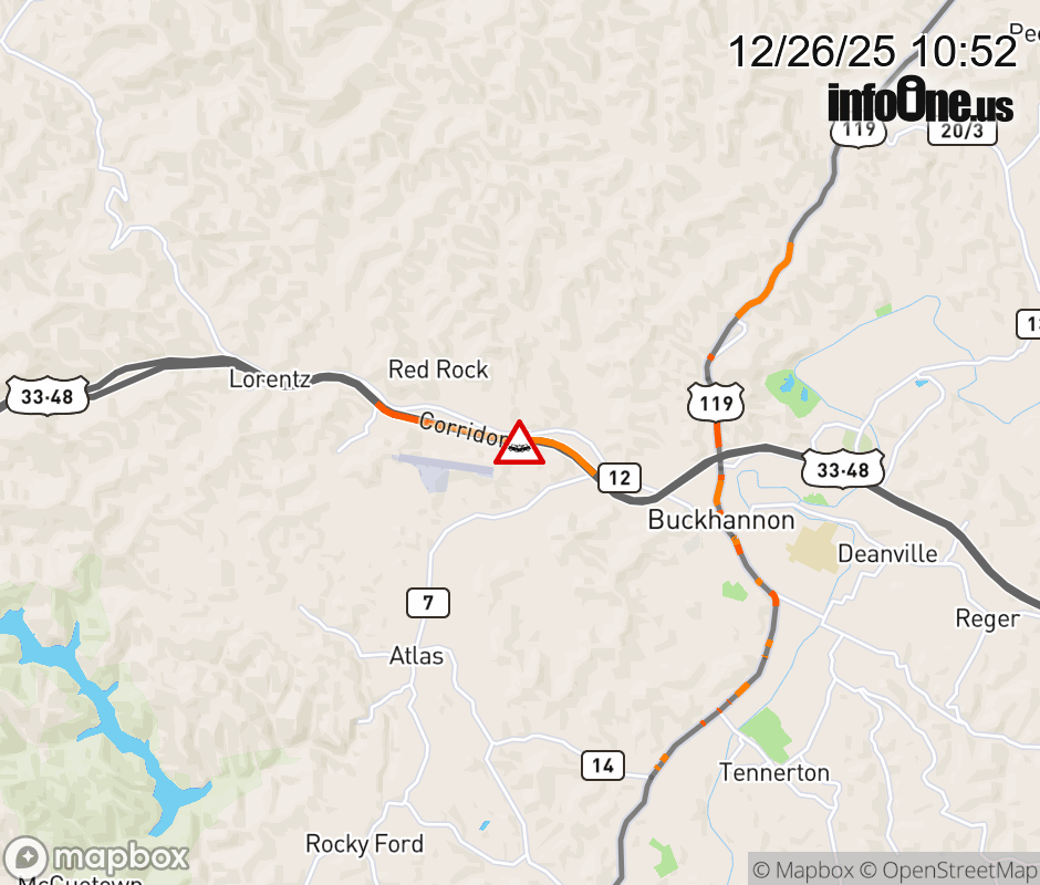 Vehicle Crash on US-33 East & WBUC Rd in Buckhannon. The eastbound road is closed. Updated: Fri 12/26/25 10:52 AM EST ![]() Updated: Fri 12/26/25 10:52 AM EST |