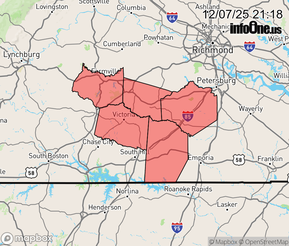 Canceled 12/7/25 9:24 PM Winter Storm Warning issued December 7 at 9:17PM EST until December 8 at 6:00PM EST by NWS Wakefield VA * WHAT... Snow expected. Total snow accumulations between 3 and 5 inches. * WHERE... Prince Edward, Brunswick, Dinwiddie, Lunenburg, and Nottoway Counties. * WHEN... From 6 AM to 6 PM EST Monday. * IMPACTS... Plan on slippery road conditions. The hazardous conditions could impact the Monday morning and evening commutes. ![]() |