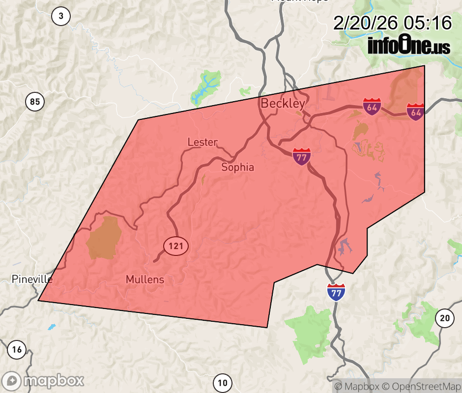 Canceled 2/20/26 5:30 AM Severe Thunderstorm Warning issued February 20 at 5:14AM EST until February 20 at 5:30AM EST by NWS Charleston WV At 514 AM EST, a severe thunderstorm was located near Sophia, or 10 miles southwest of Beckley, moving east at 55 mph. HAZARD...60 mph wind gusts and penny size hail. SOURCE...Radar indicated. IMPACT...Expect damage to roofs, siding, and trees. Locations impacted include... Beckley, Mullens, Mabscott, Sophia, Crab Orchard, Dry Creek, Macarthur, Coal City, Shady Spring, Twin Falls State Park, Beaver, Daniels, Lester, Rhodell, Ghent, Josephine, and Maben. ![]() |