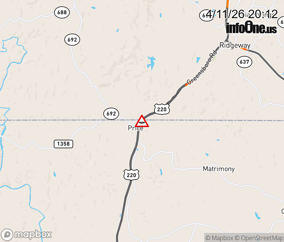 On US-220 North in the County of Franklin, in the vicinity of Glen Meadow Dr; County/City/Town Line: NEW ROCKY MOUNT, motorists can expect delays due to a vehicle crash. Lane closures exist. ![]() |