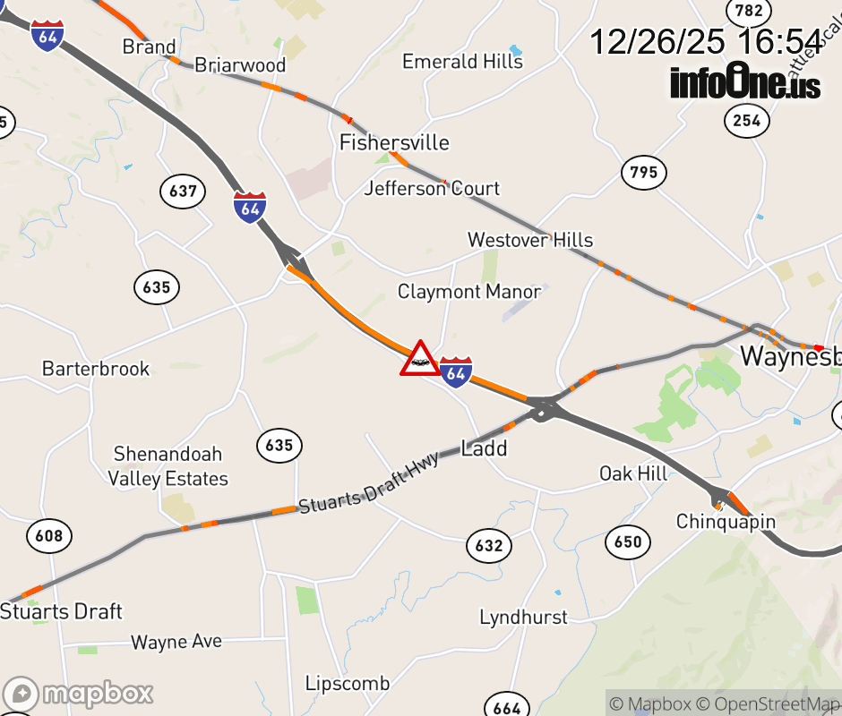 On I-64 at mile marker 93.2 in the County of Augusta, motorists can expect delays due to a vehicle crash. The west right shoulder is closed. Updated: Fri 12/26/25 4:54 PM EST ![]() Updated: Fri 12/26/25 4:54 PM EST |
